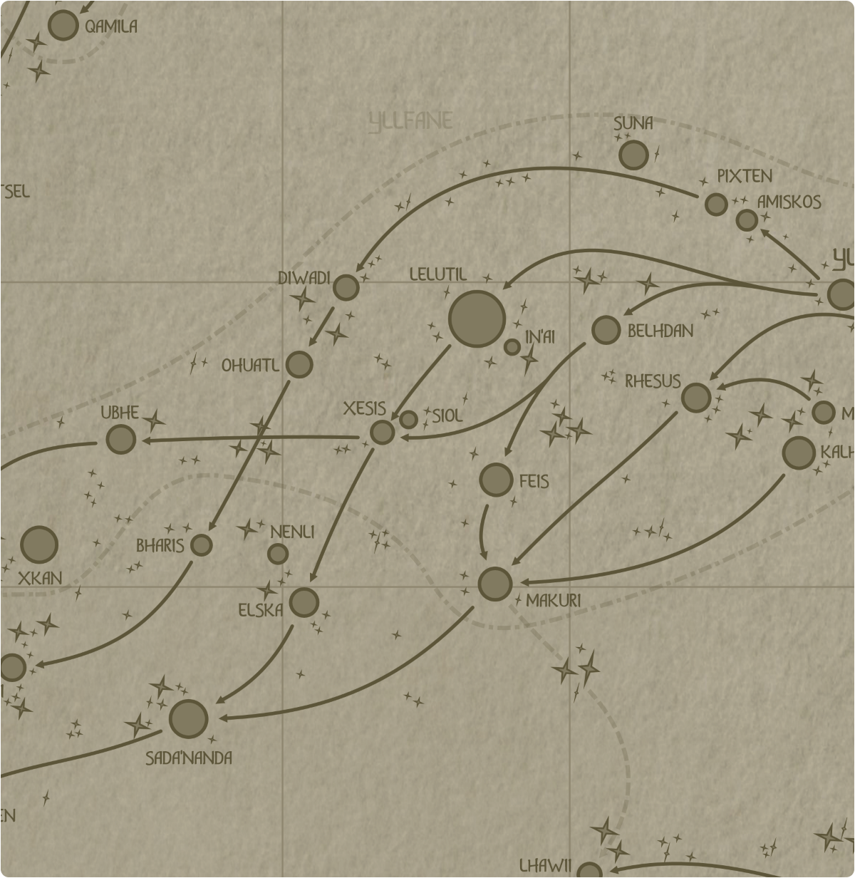 Planetary Star Systems: Diwadi, Feis, In'ai, Lelutil, Makuri, Ohuatl, Siol, Xesis Orphan Stars: 5 Dwarf Stars: 28 Empire: Yllfane Adjacent Sectors: Sector d7, Sector d9, Sector C8, Sector e8