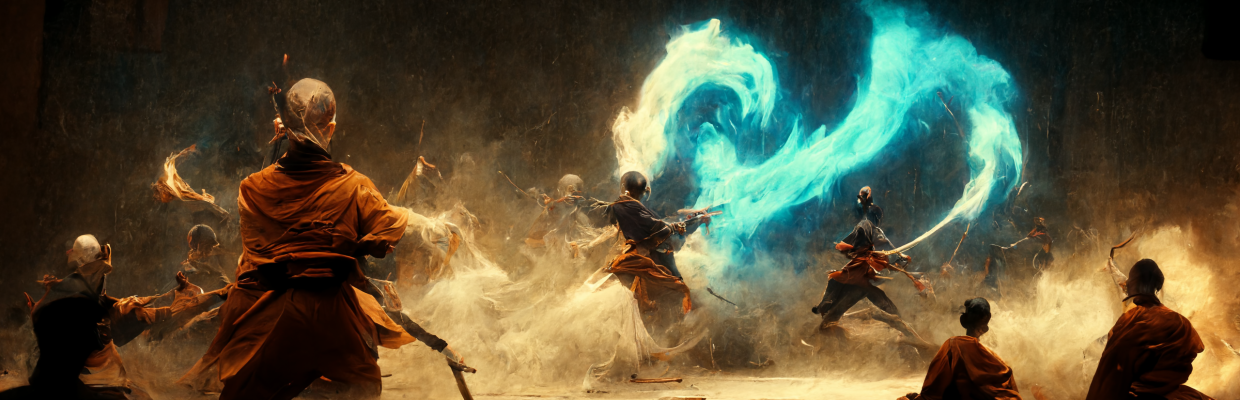 monks clashing with blue and yellow fire in a dramatic combat scene, abstract styling
