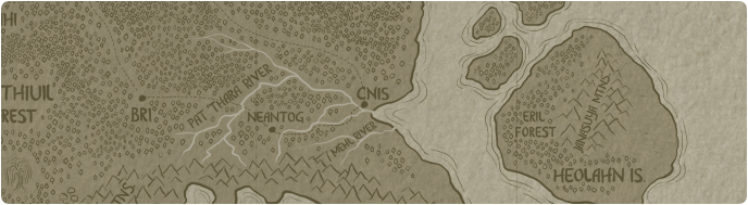 Cnis is nestled up against the jagged coast of southeastern Gerth, where the Pat 'thara river meets the Thoir sea. The city is built upon the sides of the sea cliffs, and it also straddles the river as it flows over the cliffs and into the sea below. Wooden catwalks and winding staircases carved into the rock connect the city, which also includes a few central gathering points carved into the cliff face