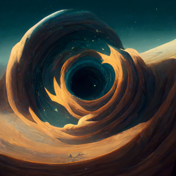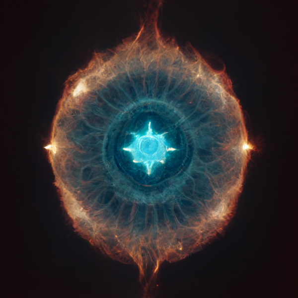 a blue and gold nebula with a bright center and a flower shaped void around the center