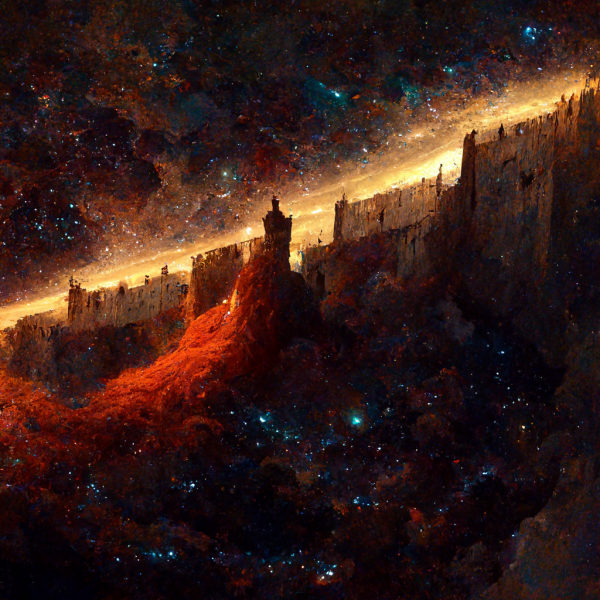 a council of rough statues encircles an obelisk floating over a glowing altar