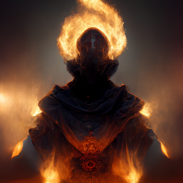 a monk with a halo of fire and burning hands