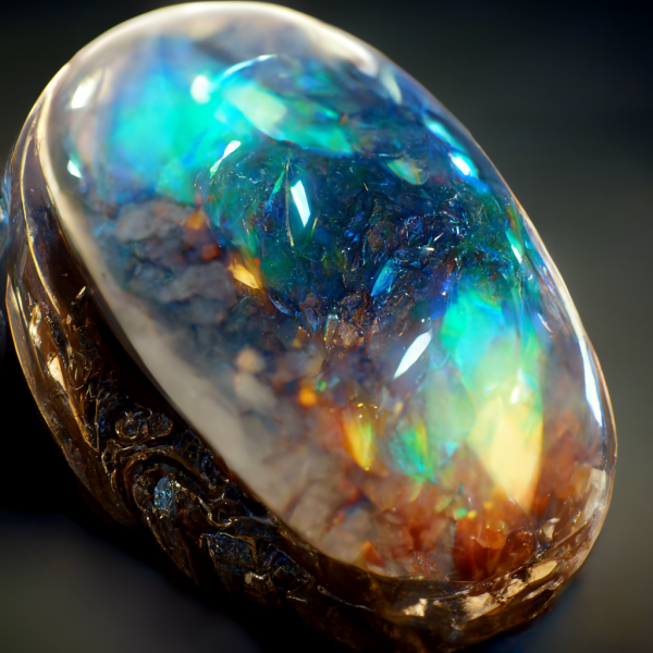Description: This multicolored and reflective gemstone is a form of silica. It contains 5-10% water, though this is not enough to move the gems via bindings