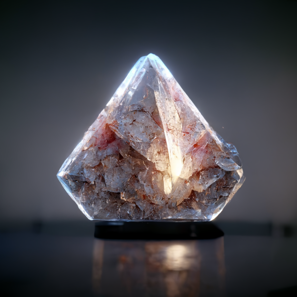 a crystal of quartz and rose quartz shaped like a glass award trophy