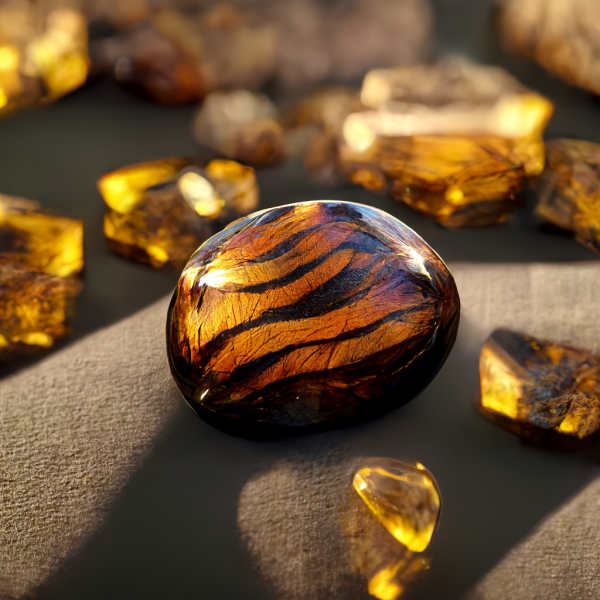 a polished black and dark orange gemstone whose stratification looks like the stripes of a tiger's fur