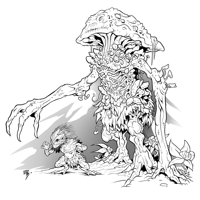 Standing a little shorter than an average Human, the Manitari have bodies made of soil and skeletons of stone, some of which protrudes out from the surface. These inanimate bodies are controlled by a nervous system of fungal veins which permeate the soil body. They have long arms and slightly shorter legs, and lean forward, sometimes ambling on all fours. Upon the backs the fungal roots extend up out of the soil and grow into mushrooms, which are also bioluminescent. Their heads consist of fungal matter, and resemble a mask with two eyes and a small, round mouth. Their voices have a hollow, whistling quality. Their face is not capable of expression, but their irises and pupils are capable of quickly contracting and expanding, which they can control to convey emotion. Their heads sweep backwards on the top, turning into “gills” which are used for their sense of smell