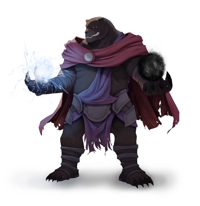 Nahkon Envoy Nahkoen have an intimidating build, both tall and broad, with equally wide shoulders and abdomen. Their bodies are covered in fur and their facial features are ursine. They have human shaped hands and feet which are covered in fur, though this fur is short on the underside. On each digit, above the nail are sharp, semi-retractable claws. They also have long canines relative to humans. Unlike many other species, the Nahkoen do not have an inverted shin, and their legs are thick and powerful. Despite their large size, they are surprisingly fast