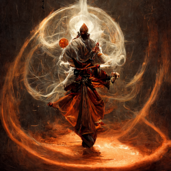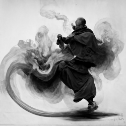 a monk expelling smoky energy in a swirling white and orange burst, vibrant colors