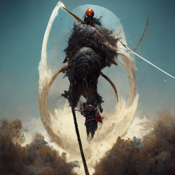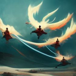 a warrior leaping in the air surrounded by currents of air, subtle blues and whites