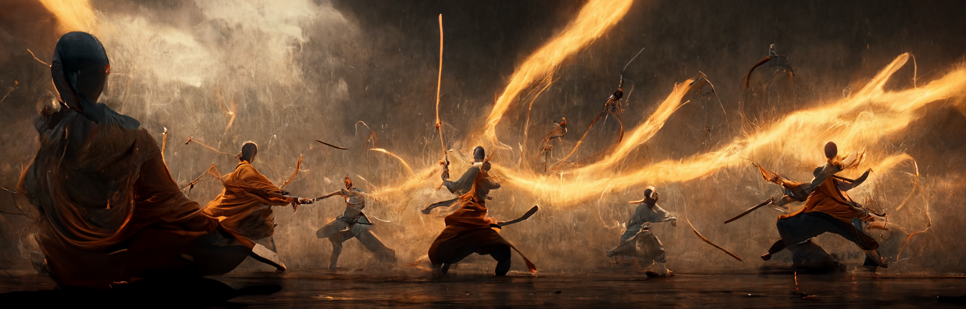 monks clashing with blue and yellow fire in a dramatic combat scene, abstract styling