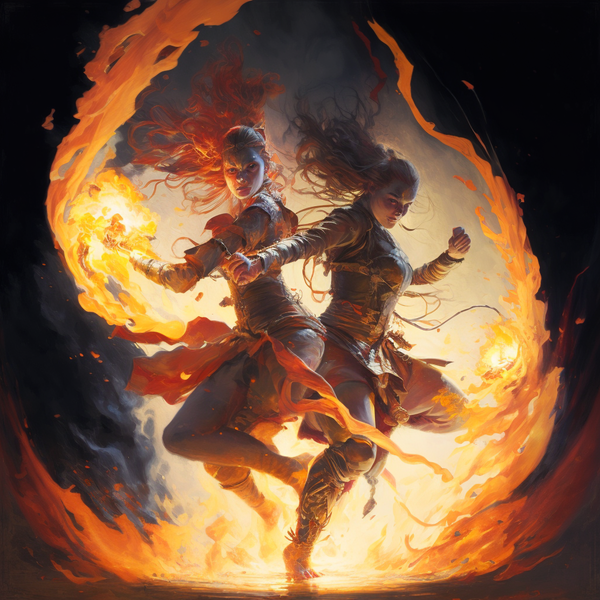 two pyromancers spar in a dance of fiery blasts