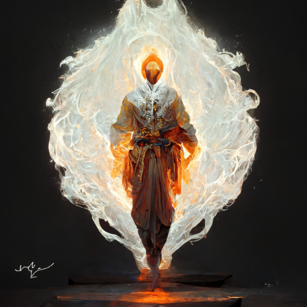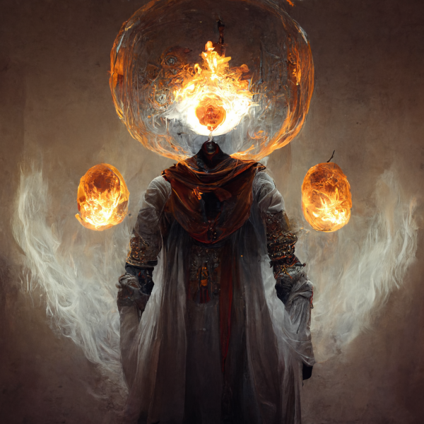a pyromancer with burning robes and a painted white face