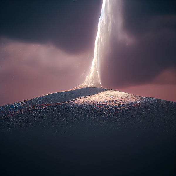 a gentle column of light descends from the sky and touches a shimmering, lavender sand dune