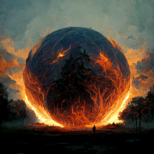 a dark blue sphere of shadow, burning in hot orange flames in a forest at sunset
