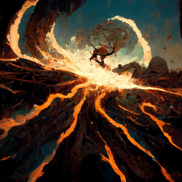 an explosion viewed from a tilted perspective, shooting out fingers of fire in an energetic pattern