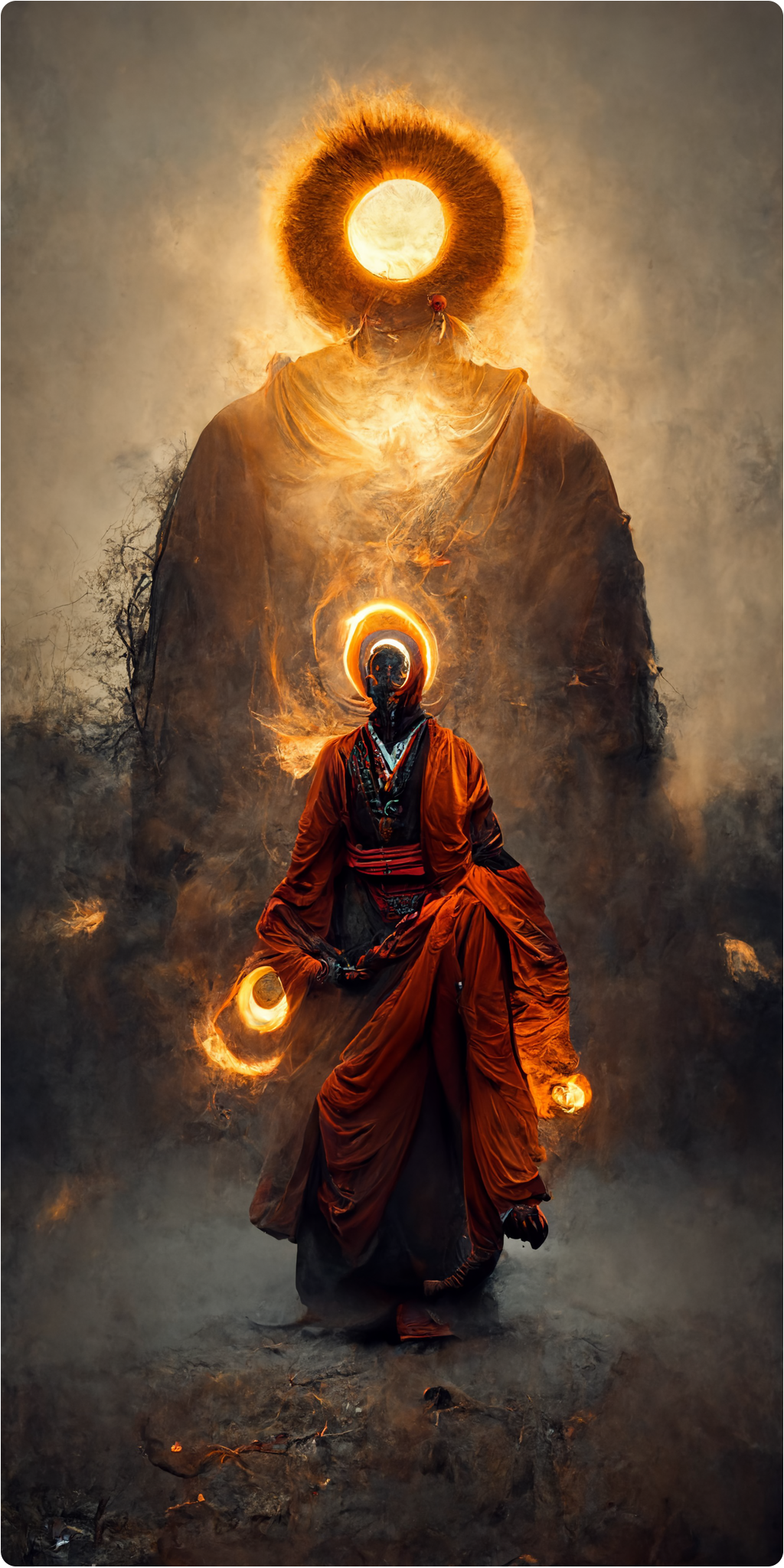 A symbolic representation of agni's presence, a firey monk overshadowed by a robed body with a halo of fire for a head