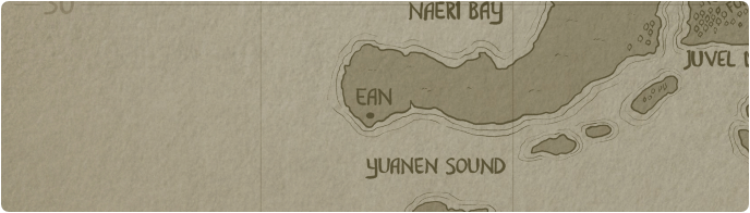 Ean is essentially little more than a fortress, though it has a small port and enough housing to cover the merchants and militia that keep the fortress and the ports running. Some of the trade goods will continue on via the coastal road. The people of Ean are welcoming to travelers and sailors, but unflinchingly intolerant of unlawfulness, even tavern brawls. The standing militia also operates a small fleet that patrols the western and southern shores of the continent. The organized nature of the city and its military element is somewhat atypical of Naer