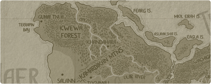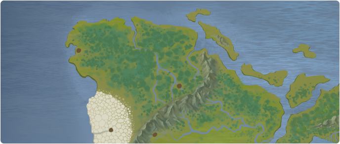 Mysterious and unexplored, this forest in the farthest northern reaches of Craic is home to the coastal resort town of Guhai tnua and the research site, Khandahara. Two rivers flow north through it, the Daeng'Ka and the Opilos