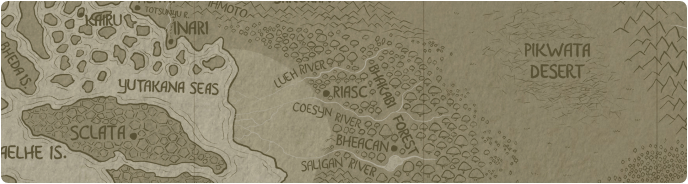 Riasc is built on the border between the southern salt flats and the Bhakabi forest. While this city resides within Yuanen's borders, it has no practical ties to the rest of the country. Riasc's population is mostly Baumeni, with a smaller group of Humans