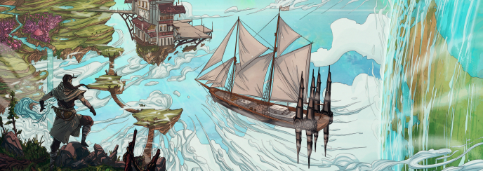 Description: Sherpa Class starships are unmatched in their ability to comfortably navigate cluttered regions of space and tight canyons when planetside. They serve as guide ships for larger fleets, scouts, and mapping ships for treacherous skies. Sherpas have complicated rigging and sail plans to help them navigate with alarming precision and speed. Some Sherpas even have grapping hooks and telescopic push poles. Their complex design has its drawbacks, sacrificing open sky top speed to gain their legendary maneuverability